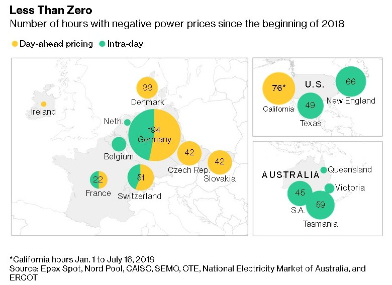 As more wind and solar comes online, electricity generation exceeds demand at various times of the day, creating subzero costs. Peak midday sun around noon and early morning wind gusts or cloud cover push coal and gas plants to shut down, not an original design feature. California had 110 hours of negative power prices in the "day-ahead" market.